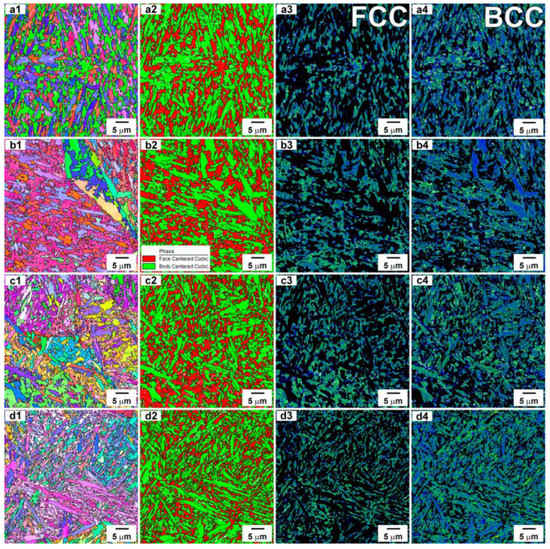 EBSD analysis of the Fe-0.44C steel after quenching at 140 °C (a1–a4), 160 °C (b1–b4), 200 °C (c1–c4), and 250 °C (d1–d4), RA is emphasized by red color (column 2), KAM map (columns 3, 4). BCC—Body Centered Cubic; FCC—Face Centered Cubic.