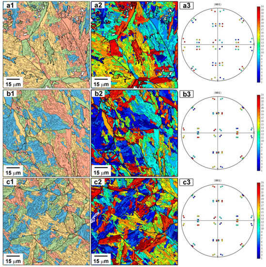 EBSD analysis of the steel subjected to Q&P processing with quenching in a salt bath at temperatures of 160 °C (a1–a3), 200 °C (b1–b3), and 250 °C (c1–c3): (column 1) misorientation map showing HABs of the reconstructed austenite grains and packets; (column 2) identification of packets in PAGs; (column 3) {001} pole figure showings (0 0 1) [1 0 0] orientations that maintain the K–S orientation relationship.