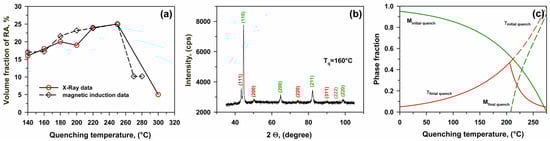 Effect of quenching temperature on the volume fraction of RA (a); typical XRD spectra after quenching at 160 °C (b); calculated Tq-dependence of the phase fraction of austenite and secondary martensite, assuming full C partitioning into austenite prior to the final quenching (c).
