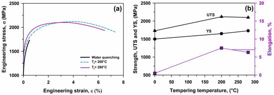 Engineering stress–strain curves are presented in Figure 10. After water quenching, the failure occurs immediately after yielding; the elongation-to-failure is 0.5%, and the YS and UTS are 1500 and 1730 MPa, respectively. Therefore, the quenched specimen exhibits intense work hardening after yielding. Tempering at 200 and 280 °C provides a strong increase in the ductility and strength, concurrently, due to work hardening after continuous yielding. After tempering at 200 °C, the YS, UTS and elongation-to-failure are 1640 MPa, 2120 MPa, and 7.3%, respectively. After tempering at 280 °C, the YS, UTS, and elongation-to-failure are 1730 MPa, 2100 Mpa, and 6.5%, respectively. Thus, the precipitation of η-Fe2C transition carbides provides a 15% increase in the YS, and the ductility increases by a factor of ~13. As a result, the PSE of ~1.5 × 104 MPa·% is relatively high after tempering. The hardness of 55 HRC is nearly independent of tempering.