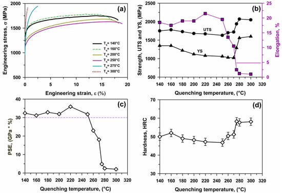 Typical engineering stress–strain curves (a), effect of quenching temperature on the tensile properties (the YS, UTS, elongation) (b), PSE (c), and hardness (d) of the Fe-0.44C steel.