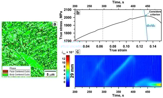 EBSD analysis of the Fe-0.44C steel after the tensile test (a) and the corresponding sections of the true stress-time curve (b) and the local strain rate map (c) of the Fe-0.44C steel after quenching at 160 °C. Color legend shows the local strain-rate scale.
