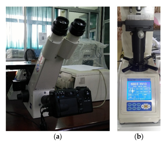 Equipment used in the tests: (a) Axiovert 25 CA Optical Microscope, (b) Brinell Hardness Tester.