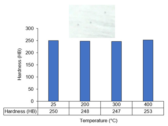 To evaluate the impact of elevated temperatures on workpiece hardness after heating, the workpiece was exposed to the designated temperature and allowed to cool naturally via exposure to ambient air. Surface hardness measurements necessitated meticulous sample preparation, including cutting, grinding, polishing, and impregnation. In order to prevent the influence of cutting heat, wire cutters were employed during sample cutting. The grinding process aimed to minimize undulation caused by the varying hardness of structural elements, while polishing removed any coarse grinding marks and scratches. Finally, deformations from the cutting, grinding, and polishing stages were either eliminated or leveled to a size sufficient for removal with an impregnating agent. Three hardness measurements were taken on each sample using a Brinell hardness tester at distinct locations, as illustrated in Figure 5. The results, presented in Figure 5, showed that increasing temperatures resulted in decreased specimen hardness to 2–3 HB at 200 °C and 300 °C. However, at 400 °C the sample demonstrated increased hardness compared to the other temperatures, although this increase was not significant within the chosen experimental temperature range.