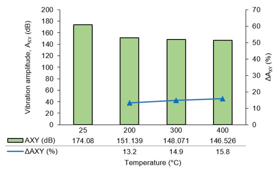 Figure 11 displays the vibration amplitudes at room temperature (a) and at 200 °C (b) in directions of (X, Y). The analysis of the no-load and individual vibration data did not indicate any resonance. The results showed that TAM reduced the vibration amplitude compared to conventional machining. The reduction in cutting vibration amplitude (ΔAXY) during TAM, as compared to milling at room temperature, is calculated using Equation (5).