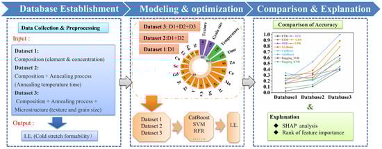 The basic flow in this work is shown in Figure 1, which consists of three main steps, i.e., establishment of datasets, construction of ML models and analysis of important contribution of formability descriptors via ML models with SHAP algorithm. The input dataset for ML algorithms generally consists of alloying composition for materials design, which usually requires a large amount of compositional datasets for improving accuracy of ML models. In this work, the accuracy of 10 ML models based on the limited amount of compositional dataset was evaluated via cross-sectionally expanding the formability descriptors including processing descriptors (annealing temperature and time) and microstructural descriptors (texture and grain size) into each compositional dataset, which can be categorized into Dataset 1, Dataset 2 and Dataset 3 shown in Figure 1. The critical contributions of formability descriptors could be calculated via the trained ML model and SHAP methods to identify the important factors on improving the stretch formability of Mg sheet alloy at room temperature, which can be used for design of Mg sheet alloy with high RT formability.