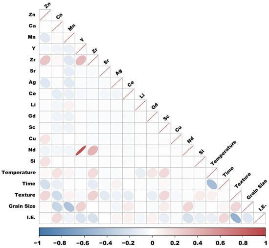 It is critical for the maximum likelihood model to establish the mapping relationship between data descriptors. More accurate descriptor relationship will lead to less error in the machine learning predictions. Figure 2 shows the heat map of Pearson’s correlation coefficients between the descriptors, the linear correlation between most of descriptors is very weak, and their correlation coefficient does not exceed 0.4. In other words, there are no significant redundant features in the database used in this work. In this work, Erichsen values (I.E.) were set as the target descriptor. It can be seen that there is no obviously linear relationship between I.E. and these descriptors, which suggests that the Erichsen value of Mg alloys is determined by various factors rather than a simple monotonic or linear relationship. The main reasons for this phenomenon are the complex interactions among the alloying elements, process parameters and microstructure, which would affect the plastic deformation mechanisms and thus stretch formability of Mg sheet alloy. Therefore, it is difficult to generalize with a simple linear relationship between target descriptor (I.E.) and other input descriptors as shown in Figure 2. Thus, a nonlinear algorithm is recommended for more accurate machine learning models in this work.