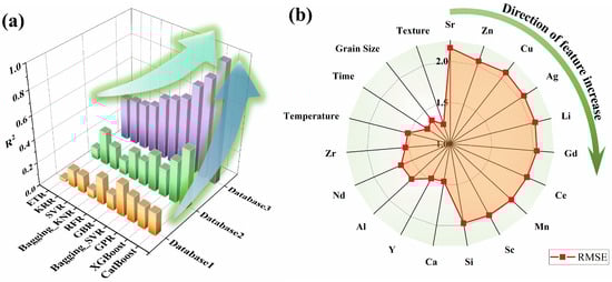 After training the 10 algorithmic models and performing hyperparameter optimization, the accuracy of the test set of 10 ML models on each dataset was calculated in Figure 3a, in which the accuracy of the training set was between 0.8 and 0.95. To highlight the gap between different ML algorithms on each dataset, the R2 of test set of CatBoost model with the best prediction is used as the benchmark 1 to demonstrate the relative accuracy of other ML models on various datasets and the results are summarized in Figure 3a. All ML models showed an increasing accuracy via expanding the Dataset 1 to Dataset 2 with the annealing process descriptors, in which the accuracy is increased by 287.5% for ETR model and 157% for CatBoost model. When the dataset is further expanded from Dataset 2 to Dataset 3 by adding microstructural descriptors, the accuracy of all ML models is further improved, with 267.7% accuracy enhancement for ETR model, 227.5% for Bagging_KNR model, 207.3% for GPR model, and more than 100% for the remaining models such as RFR, GBR, and XGBoost. Overall, the accuracy of all ML models based on the limited compositional dataset shows a significant improvement via cross-sectionally expanding the formability descriptors such as processing and microstructural descriptors in datasets. Figure 3b shows the influence of adding various amount of formability descriptors on the accuracy of CatBoost model. The resulting calculation shows that the root–mean–square error (RMSE) of the CatBoost model is decreased with the addition of formability descriptors, suggesting that the accuracy of CatBoost model is increased. Therefore, it can be concluded that the cross-sectional expansion of descriptors could effectively improve the accuracy of the ML models with a small dataset.