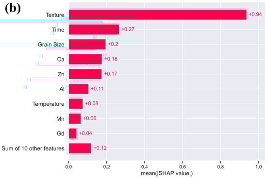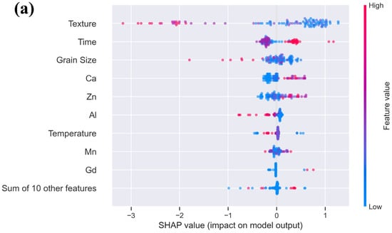 To reveal the effect of formability descriptors on ML model accuracy, the SHAP values of each descriptor was calculated based on the CatBoost model in the SHAP library. As shown in Figure 4a, a positive/negative SHAP value of a feature (formability descriptor) means that the feature (formability descriptor) raises/lowers the value of Erichsen Index. For each feature, the data points on the horizon line have more coverage and its impact on the predicted result is greater, suggesting this feature is more important on the ML model. In Figure 4a, the calculating result suggests that the texture intensity, grain size and the content of Al has an inverse relationship with the SHAP value; however, the annealing time, the content of Ca and Zn are proportional to the SHAP value. In Figure 4b, the average of the absolute SHAP values of a feature can be considered as one factor evaluating its importance on the value of Erichsen index. It can be found that the texture intensity is the most important descriptor. In other words, texture acts as an important role affecting formability of magnesium sheet alloys, which has been verified in the most of experimental research. As also shown in Figure 4a, the texture intensity is smaller and the SHAP value is larger, which suggesting that the value of Erichsen Index is higher for better formability.