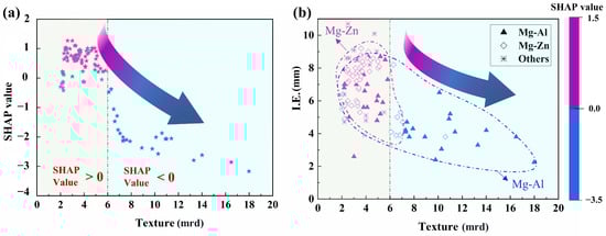 Figure 5. (a) The SHAP value and (b) I.E. change with texture intensity of Mg alloys.