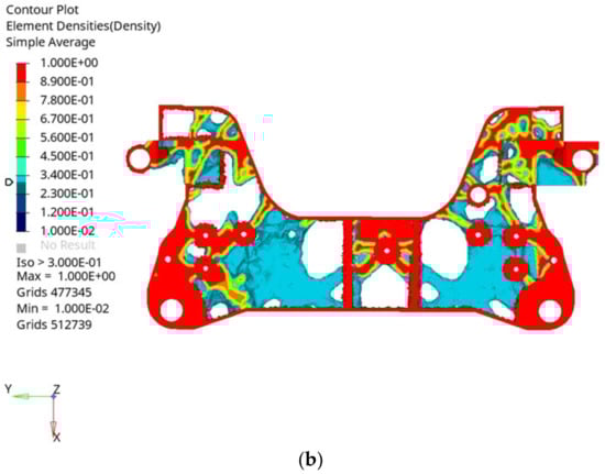 Topology optimization results of aluminium alloy front subframe envelope under multiple working conditions. (a) Positive results of multi-condition topology optimization. (b) Rear result of multi-condition topology optimization.