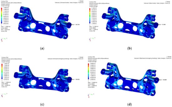 The displacement boundary conditions and load boundary conditions from Section 3.1 are used to analyse the strength performance of the optimized aluminium alloy front subframe. Figure 16 shows the cloud diagram of the stress analysis results of the optimized aluminium alloy front subframe under some typical working conditions. According to the cloud diagram of the stress analysis results, the working condition corresponding to the maximum stress of the optimized aluminium alloy front subframe is the limiting condition of the one side deep pit condition, and the stress value is 179.3 MPa, which is 1.3 MPa less than the value of 180.6 MPa before optimization.