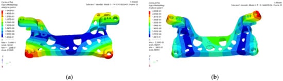 Free modal analysis is carried out on the optimized aluminium alloy front subframe, and the first six rigid body modals are filtered out. The cloud diagram of the free modal analysis results is shown in Figure 17. Table 8 shows the comparison results of the free modal analysis before and after optimization of the aluminium alloy front subframe. After optimization, the first-order modals and fifth-order modals of the aluminium alloy front subframe are slightly reduced, while the other modals are improved. These results are higher than the ground and engine excitation frequencies, and the difference between each modal frequency is more than 20 Hz. The optimized aluminium alloy front subframe meets the modal performance requirements.