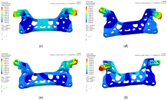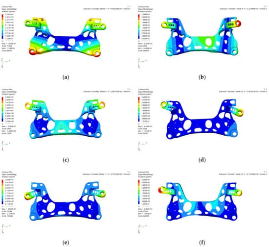 Optimized non-rigid body modal shapes for the front 6th order of the aluminium alloy front subframe. (a) First modal shape. (b) Second order modal shapes. (c) Third order modal shapes. (d) Fourth order modal shapes. (e) Fifth order modal shapes. (f) Sixth order modal shapes.