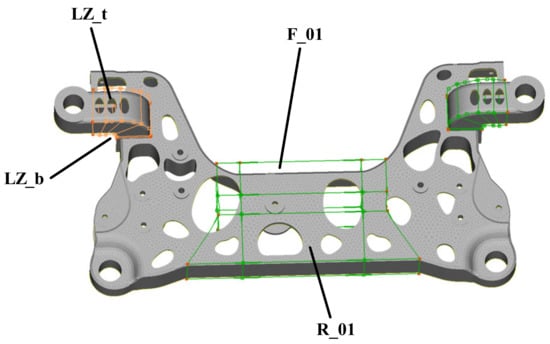 The parametric model of the aluminium alloy front subframe is created in the Morph module of Ansa. The Morph module can quickly carry out mesh deformation and create shape design variables. Four positions of the aluminium alloy front subframe are selected to set the parametric variables. The parameterized model and optimized positions are shown in Figure 7. The four positions are named F_01, R_01, LZ_t, and LZ_b. The variation range of the parameterized variables at four positions of the aluminium alloy front subframe is shown in Table 3.