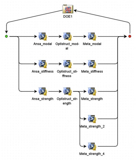 DOE1 is the experimental design module; the Ansa_modal branch is the modal optimization branch, the Ansa_stiffness branch is the static stiffness optimization branch, and the Ansa_strength is the strength optimization branch. Regarding the strength optimization, three working conditions with maximum stresses are considered. They are the over one side deep pit condition, forward braking condition, and forward emergency braking condition.