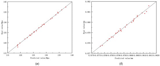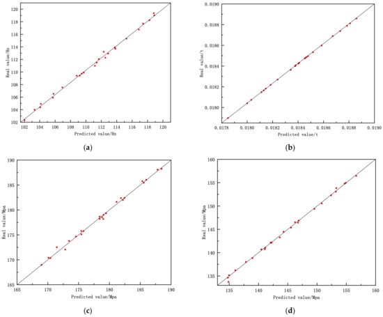 Figure 11 shows the fitting results of the predicted and actual values of each response of the aluminium alloy front subframe. The abscissa is the predicted value, and the ordinate is the actual value. The points on the 45° oblique line indicate that the predicted results are the same as the actual results.