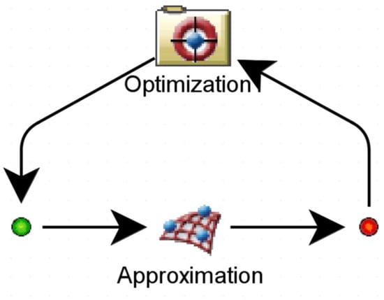 The multi-objective particle swarm optimization algorithm [32] was used to optimize the aluminium alloy front subframe. Multi objective particle swarm optimization is a population-based search process that uses the principles of evolutionary computation: first, initialize from a group of random populations, and search for the optimal value through updating the population generations. The evolution process depends on the previous population. Compared to other optimization algorithms, the advantage of the Multi Objective Particle Swarm optimization algorithm is its strong versatility, simplicity, and ease of implementation, with fewer parameters to adjust. Figure 13 shows the multi-objective optimization design platform based on the approximate model, in which Optimization is the multi-objective optimization module. Moreover, Approximation is the approximate model obtained after generating sample points through the optimal Latin hypercube experimental design. The parameters of the multi-objective particle swarm optimization algorithm are as follows: the maximum number of iterations is set to 100, in order to obtain more optimization results; the number of particles is set to 10; the inertia weight is set to 0.9; the global increment is set to 0.9; the particle increment is set to 0.9; the maximum velocity is set to 0.1; the max failed runs is set to 5; the failed run penalty value is set to 1.0 × 1030; the failed run objective value is set to 1.0 × 1030.