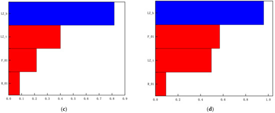 Local effect diagram of each variable and response. (a) Frequency local effect diagram. (b) Mass Local Effect diagram. (c) Local effect diagram of stress in over one side deep pit condition. (d) Local effect diagram of forward braking condition.