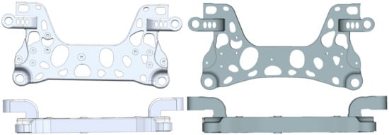Figure 15 shows the digital–analogue comparison before and after multi-objective optimization of the aluminium alloy front subframe. After optimization, the weight is reduced from 18.55 kg to 17.6 kg, reducing the weight by 0.95 kg.