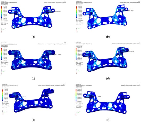 Cloud image of stress analysis results of aluminium alloy front subframe under some typical working conditions after optimization. (a) Forward braking condition. (b) Backward braking condition. (c) Forward emergency braking condition. (d) Backward emergency braking condition. (e) Over one side deep pit condition. (f) Ultimate steering condition.