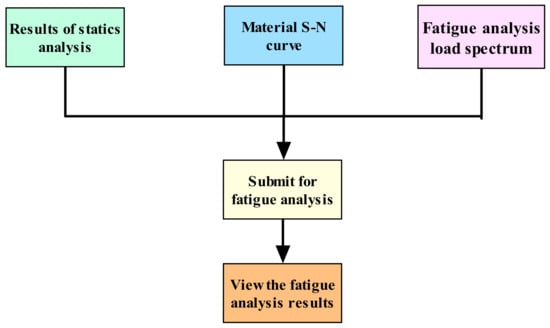 Automobile parts will be subjected to various excitation loads during use. Even if the automobile parts meet the strength requirements, they will fracture or fail due to fatigue damage. Therefore, it is imperative to carry out a fatigue analysis of the aluminium alloy front subframe. The aluminium alloy front subframe will be affected by the excitation of the ground and the engine during use because of a high stress alternating frequency; therefore, the analysis method of the high cycle fatigue is adopted, that is, the stress-life (S–N) fatigue analysis method [33,34,35,36,37]. The fatigue life analysis of the aluminium alloy front subframe is carried out in the fatigue process module of the HyperMesh software, and the whole fatigue analysis process is shown in Figure 18.