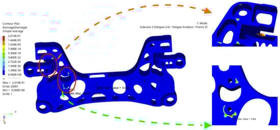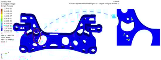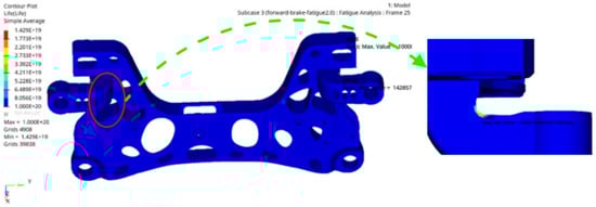 Figure 21 shows that the maximum fatigue damage of the aluminium alloy front subframe in the forward braking condition is 2.49 × 10−6, which is far less than the target value of 0.25; thus, the design requirements are satisfied. Figure 22 shows that the minimum fatigue life of the aluminium alloy front subframe in the forward braking condition is 1.42 × 1019, which also meets the design requirements.