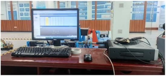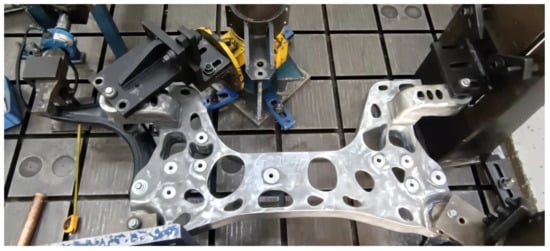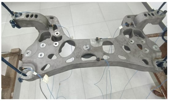 The aluminium alloy front subframe studied in this paper is produced by an integrated casting method. After casting, the aluminium alloy front subframe sample is obtained by fine machining. To verify the accuracy and reliability of the finite element analysis results, a free modal test of the finished aluminium alloy front subframe was carried out. The modal test equipment used is shown in Figure 23, and the free modal test platform built for the aluminium alloy subframe is shown in Figure 24. The aluminium alloy front subframe sample was suspended on the test bench by a special rubber cord for the modal test so that it was in a free suspension state. The method of force hammer knocking and multipoint picking up was adopted for the modal test [38]. Eight test points were selected in the aluminium alloy front subframe body, and the force hammer knocking position was repeatedly knocked six times to obtain the average value to improve the accuracy of the test results.