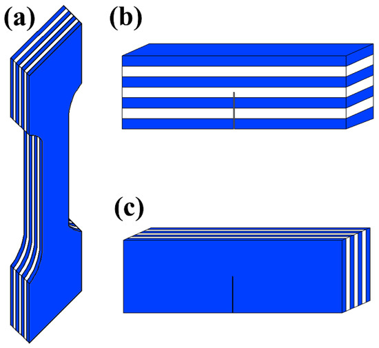 (a) Schematic diagram of tensile samples and fracture toughness samples in (b) arrester orientation and (c) divider orientation, respectively (Deep blue regions represent the TiAl alloy and white regions represent the DsTi700 alloy).