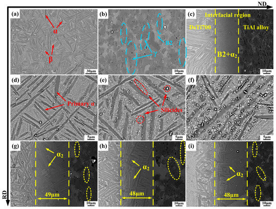 Figure 2 shows the microstructure of the initial and heat-treated composites. As is shown, the initial DsTi700 shows a Widmannstatten structure (Figure 2a). The initial TiAl alloy is composed of a γ phase elongated along the rolling direction and a B2 phase (Figure 2b). The initial interfacial region was 38 μm in thickness, composed of a fine acicular α2 phase and B2 matrix (Figure 2c). The formation mechanism of the microstructure is similar to our previous study [18]. Figure 2d–f shows the microstructure of the heat-treated DsTi700 alloy. After heat treatment, the primary α phase is in lath and a large amount of silicides are precipitated from the β phase. With the increase in temperature, the content of the primary α phase decreases from 37.9 vol.% to 25.6 vol.%, but the content of silicides increases from 0.8 vol.% to 4.6 vol.% (Figure 2d–f). Moreover, with the increase in temperature, the silicides exhibit dual-scale and the size also gradually increase. Figure 2g–i shows the heat-treated microstructure of the interfacial region and the TiAl alloy. After heat treatment, the thickness of the interfacial region increased from 38 μm to 48–49 μm. With the increase in temperature, the acicular α2 phase gradually became coarser. As for the TiAl alloy, the γ still elongated along the rolling direction, but the aspect ratio decreased.