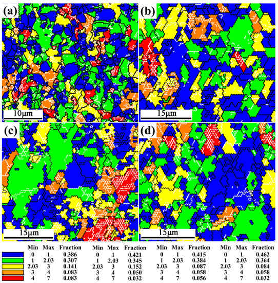 GOS analysis of the initial and heat-treated TiAl alloy: (a) initial TiAl alloy [13], (b) HT1, (c) HT3 and (d) HT5.