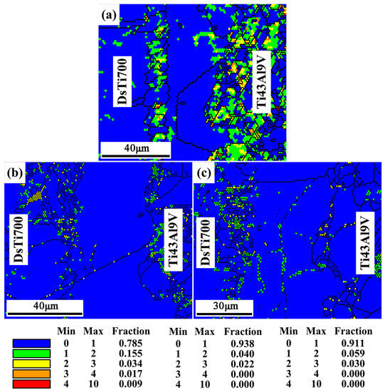 Figure 3 shows the grain orientation spread (GOS) map of the initial and heat-treated TiAl alloy. GOS is defined as the average difference in orientation between the average misorientation and all measurements within one single grain. In other words, if the GOS value of a grain is high, there is a high dislocation density and severe lattice distortion. If the GOS value of a grain is low, this means there is low energy stored in this grain. As is shown in Figure 3, the blue and green areas represent the grain with a low GOS value and the yellow, orange and red areas represent the grain with a high GOS value. The white lines represent 2–15° grain boundaries and the black lines represent 15–180° grain boundaries. In the initial TiAl alloy, the volume fraction of grains with a high GOS value was 30.7% [13] (Figure 3a). After heat treatment, the volume fraction of the grains with a high GOS value decreased from 23.4% (yellow region + orange region + red region) to 17.4%, which means that when the heat treatment is at 920–960 °C, the dislocations, substructures and energy stored in the TiAl alloy are significantly reduced. The GOS analysis of the DsTi700 alloy is not shown in this article, because our previous study showed that after a 590 °C/1 h/FC heat treatment, the GOS value of the DsTi700 alloy was very low [13]. In this research, the GOS value of the DsTi700 alloy must be lower than our previous study. Therefore, the GOS value of the DsTi700 alloy is not shown in this article.