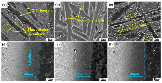 Figure 5 shows the microstructure of heat-treated composites with a different secondary annealing process. As shown in Figure 5a–c, with the increase in temperature, the content of the secondary α phase and silicides do not change obviously. However, the morphology of the secondary α phase changes from fine acicular to lath, and finally forms a lamella structure. Figure 5d–f illustrates that after secondary annealing, the thickness of the interfacial region is nearly unchanged. However, a large amount of acicular α2 phase is precipitated from the B2 matrix. It is necessary to point out that there is no obvious change in the microstructure of the TiAl alloy at 700–750 °C. Therefore, in this article, we do not discuss the microstructure evolution of the TiAl alloy after secondary annealing.