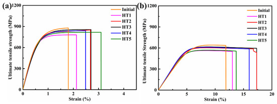 Figure 6 and Table 2 show the 25 °C and 700 °C tensile properties of initial and heat-treated composites. At 25 °C, the Young modulus (E), ultimate tensile strength (UTS) and elongation (E.L.) of initial composite were 140.2 GPa, 876 MPa and 1.1%, respectively. After heat treatment, the E of the composites were nearly unchanged, which indicates that heat treatment has little effect on the E of composites. The HT3 composite had the highest UTS 852 MPa and E.L. 2.0%. This means that heat treatment can significantly improve the room-temperature plasticity of a composite (nearly two times that of the initial composite) without sacrificing strength too much (reduced by 2.7%). For the heat-treated composite, with the increase in primary annealing temperature, the UTS exhibited a trend of first increasing and then decreasing, but E.L. continuously increased. However, the secondary annealing temperature has little effect on the UTS and E.L. of a composite. The variation trend of tensile properties at 700 °C is similar to the tensile properties at 25 °C. The reasons for these phenomena can be explained by the microstructure and fracture morphology of composites, which will be discussed below.