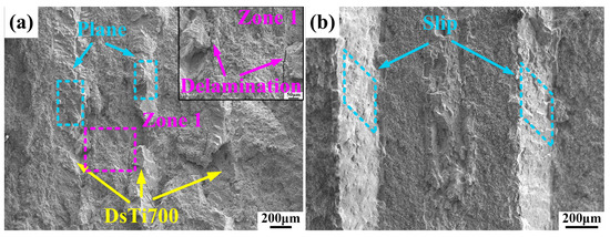 Figure 7 shows the fracture morphology of the 25 °C tensile test composites. The macroscopic fracture morphology of the initial composite shows that the fracture surface of the DsTi700 alloy is a plane, which indicates that the plasticity of the initial DsTi700 is poor (Figure 7a). Moreover, the delamination phenomenon is observed in the initial composite, which may further decrease the plasticity of the composite. After heat treatment, the fracture surface of the composite becomes stepped and the DsTi700 alloy is fractured in shear mode, which suggests the enhancement of the DsTi700 alloy (Figure 7b). Additionally, the delamination phenomenon cannot be observed in the heat-treated composite.