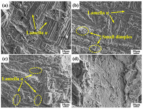 Figure 8 shows the 25 °C fracture morphology of the initial and heat-treated DsTi700 alloy. Figure 8a shows that the initial DsTi700 alloy exhibits a brittle fracture and a lamella α phase can be observed. With the increase in primary annealing temperature, the content of dimples gradually increased. When the temperature reached 960 °C, the DsTi700 alloy was completely transformed into ductile fractures.