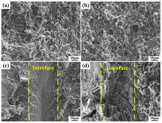 Figure 9 is the 25 °C fracture morphology of the initial and heat-treated TiAl alloy and the interfacial regions. Figure 9a,b shows that both the initial and heat-treated TiAl alloy exhibit brittle transgranular fractures. This demonstrates that although heat treatment can decrease the GOS value of a TiAl alloy, it cannot change the fracture mode of the TiAl alloy. The initial interfacial region exhibits cleavage fractures (Figure 9c), but the HT3 composite exhibits quasi-cleavage fractures (Figure 9d). This means that heat treatment can soften the interfacial region, reduce its residual stresses and change its fracture mode.