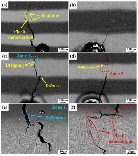 Figure 10 is the crack propagation features of the initial and heat-treated composites in AO. Figure 10a shows that the crack started in the DsTi700 alloy then passed through the TiAl alloy in a straight line. When the crack propagates to the next layer of the DsTi700 alloy, crack deflection, bridging and plastic deformation can be observed. However, for the HT1 composite (Figure 10b), the crack propagates forward in a straight line, which indicates the low fracture toughness of the HT1 composite. For the HT3 composite, crack deflection and bridging are observed at the interfacial region and in the DsTi700 alloy, respectively. Moreover, the magnified area in zone 1 (Figure 10e) shows that crack deflection is observed at the acicular α2 phase in the interfacial region (marked with the blue dashed lines). This illustrates that the precipitated α2 phase is beneficial for the improvement of fracture toughness. For the HT5 composite (Figure 10d), besides crack deflection and bridging, plastic deformation is also observed in the DsTi700 alloy (Figure 10f).