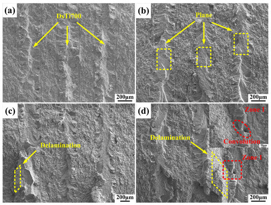 Figure 11 shows the crack propagation features of the initial and heat-treated composites in the DO. Figure 11a shows that in the DO, the fracture morphology of the initial DsTi700 alloy is rugged. This means that the crack propagation is resisted by the DsTi700 alloy. In Figure 11b, the fracture morphology of the DsTi700 is a plane, which indicates that the resistance against crack propagation is reduced. For the HT3 composite (Figure 11c), the DsTi700 alloy is fractured in shear mode and the delamination phenomenon is observed between the DsTi700 alloy and interfacial region. The A.A. Griffith model shows that the critical stress of the crack tip can be reduced by the elongated crack [31]: