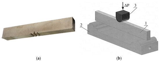 Sample (a) and the principle of the fatigue tests of the samples via three-point bending (b). The element labeled 1 is the sample, 2 is the bottom support, and 3 is the loading support.