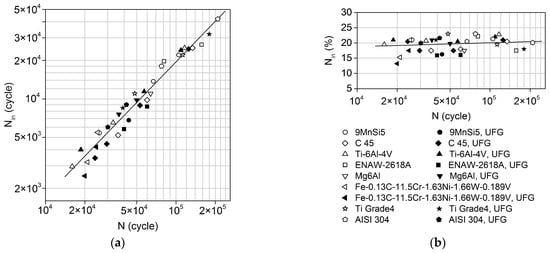 It is known that the total number of loading cycles to failure (life) of the samples or parts, N, includes the number of cycles to fatigue crack initiation, Nin, and the number of cycles for fatigue crack propagation, Nprop (N = Nin + Nprop). As demonstrated in Refs. [19,20], the value of Nin depends on the shape and parameters of the stress raiser. Let us examine the dependence of the Nin values on the life of the samples, N, for the samples of the investigated materials with the same parameters of the stress raisers. It can be seen from Figure 2a that the number of cycles to fatigue crack initiation (Nin), in both the CG and UFG materials, grows with increasing total life of samples (N). Percentage-wise, the Nin quantity amounts to about 20% of the total life of the samples (Figure 2b), irrespective of the material state and the crystal lattice type.