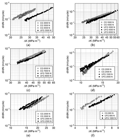 - At the same value of the coefficient (), for the majority of the investigated UFG materials, the fatigue crack propagation rate (dl/dN) is close to or lower than in the CG materials.