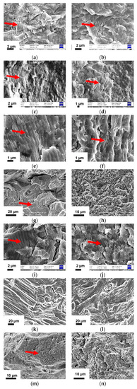 In the zone of fatigue crack propagation in the 9MnSi5 steel, irrespective of the steel’s state, microrelief consists predominantly of crystallographically oriented fragments, with some places showing fatigue striations and secondary cracks located parallel to them (Figure 4a,b). On the fracture surface of the steel with a CG structure (Figure 4a), the striations are clearly visible. In the ECAP-processed steel (Figure 4b) the striations are not clearly seen, but secondary cracks are clearly visible. The microreliefs of the fatigue fracture surfaces of the C45 steel in the CG and UFG states are similar, and consequently, their fracture mechanisms are similar, as well. In both cases, within the zone of fatigue crack propagation ductile fatigue striations and secondary cracks are visible (Figure 4c,d). As the fatigue crack grows in the CG 12Cr-2W-2Ni-0.5Mo steel, flat regions where ductile fatigue striations are visible on the surface at a large magnification occupy an ever larger area (Figure 4e). During the fracture of the samples from the UFG 12Cr-2W-2Ni-0.5Mo steel, in the central part of the fatigue zone there are visible ductile fatigue striations and secondary cracks parallel to the crack propagation front (Figure 4f).