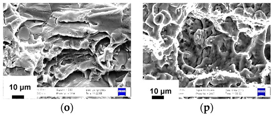 On the fatigue fracture surface of the CG Fe-0.02C-18Cr-8Ni austenitic steel, ductile fatigue striations and secondary cracks are visible (Figure 4m). On the fracture surface of the UFG steel, the quantity of secondary cracks increases manifold (Figure 4n). In austenitic steels, this may be attributed to the presence of carbide particles that, on the whole, have a negative effect on low-cycle fatigue resistance, leading to the formation of cracks and voids [26]. The fracture surface microrelief of the CG ENAW-2024 aluminum alloy may be characterized as a cyclic cleavage with tongues and steps clearly oriented along the crystallographic planes. There are areas with a dimple microrelief (Figure 4o). On the fatigue fracture surface of the UFG alloy, ductile striations alternate with the cyclic cleavage regions and dimple microrelief (Figure 4p).