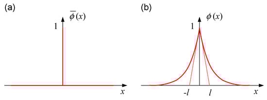 For a one-dimensional case, the topology of a sharp crack (Figure 2a) can be described by an auxiliary field variable ∈ [0, 1] with:
