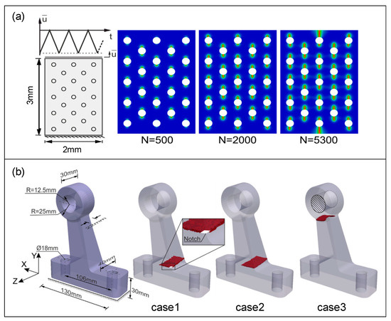 Material failure prediction is of great importance in engineering and materials science, and fatigue fracture as a typical form of failure has been of concern to scholars [1]. The process of generating cracks in components under fatigue loading can be decomposed into stages such as crack nucleation, steady-state propagation, and transient fracture. The fundamental challenge in simulating fatigue fracture is accurately tracing the crack surface under complex load conditions and material constitutive models [2,3]. Therefore, to handle the problem, numerous numerical techniques have been created, which can be classified into discontinuous and continuous methods [4,5]. However, discontinuous approaches frequently call for a way to represent the fracture topology and the related crack-tracking algorithm, which makes numerical integration and convergence challenging [6,7]. As a typical continuous method, the phase field method has recently received a wide range of attention [8,9]. The method can naturally model complex fracture processes including crack nucleation, propagation, coalescence, and branching [10,11]. Furthermore, the crack is a natural result of the simulation, obtained by solving differential equations related to the phase field, without additional fracture criteria. The crack evolution can be modeled on the fixed mesh, which avoids the tedious task of constructing the crack surface [12,13].