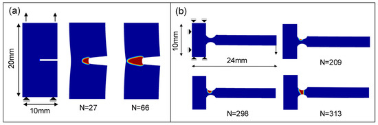 To describe rubber damage caused by cyclic loading, Loew et al. [43,44,45] extended the previous method to establish a phase field model for rate-dependent rubber fracture in a finite strain condition. A rate-dependent fatigue model is developed based on a load-history dependent fatigue damage source. The Wöhler curve and the rate of the crack growth curve are given by the simulation, and the failure behavior of the single notch under cyclic tensile load is also predicted, which is in good agreement with the experimental findings. The simulation results of two kinds of fatigue tests are shown in Figure 6a,b. Although this model accurately describes fatigue failure, its calculation speed is slow. Therefore, Loew et al. [44] provided an acceleration scheme for the cyclic loading of the phase field damage model, and the simulation speed is improved by using the cyclic skipping technique.