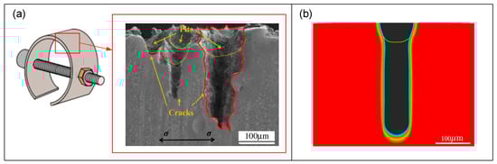 Predicting the failure of engineering parts in aggressive environments is a long-standing scientific challenge. The interaction of mechanical loading and the corrosive environment promotes the nucleation and propagation of cracks, a process known as stress corrosion cracking (SCC). It occurs in a wide variety of metallic materials and settings and is frequently facilitated by pre-existing flaws [24]. Martínez-Pañeda et al. [48] presented a phase field formulation for the long-term problem of hydrogen assisted cracking. A coupled mechanical-diffusion-phase field finite element framework is used to analyze hydrogen transport to the fracture area and subsequent cracking, and the plate with preexisting defects is considered. The model has the ability to capture complex crack growth caused by inherent defects in the corrosive environment. The strategy has quickly gained in popularity as an approach for combining different hydrogen embrittlement models [49,50,51], however, the majority of analyses are restricted to 2D boundary value problems. The deformation-diffusion-damage coupling framework developed by Kristensen et al. [52] considers the AT1 and AT2 models, inertial effects, and 3D model implementation for the first time, which can predict the defect evolution under operating conditions until the ultimate failure. Cui et al. [21,24] presented a new framework for modeling mechanically-assisted corrosion in elastoplastic solids and proposed a formulation based on the film fracture-dissolution-repassivation mechanism. The model takes into account the electrochemical driving force of mechanical straining, which speeds up the kinetics of corrosion. The simulated crack of the C-ring reveals a good agreement with the experimental observation, as shown in Figure 7. Golahmar et al. [53] proposed a multi-physics phase field model for hydrogen-assisted fatigue by combining hydrogen assisted failures and mechanical fatigue. To capture how newly formed fracture surfaces are quickly exposed to the environment, a penalty technique was used to implicitly enforce moving chemical boundary requirements. The study shows that the model sufficiently captures the sensitivity of fatigue crack growth rates to hydrogen content, and recovers the Paris law naturally, which can quantify the influence of hydrogen on the Paris law parameters.