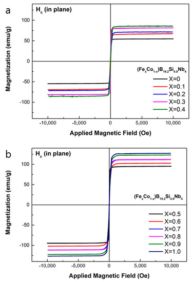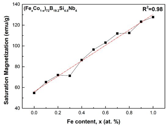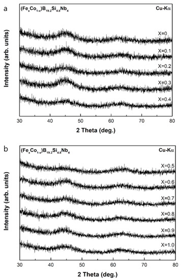 - Roy, R.K.; Panda, A.K.; Mitra, A. Effect of Co Content on Structure and Magnetic Behaviors of High Induction Fe-Based Amorphous Alloys. J. Magn. Magn. Mater. 2016, 418, 236–241. [Google Scholar] [CrossRef]