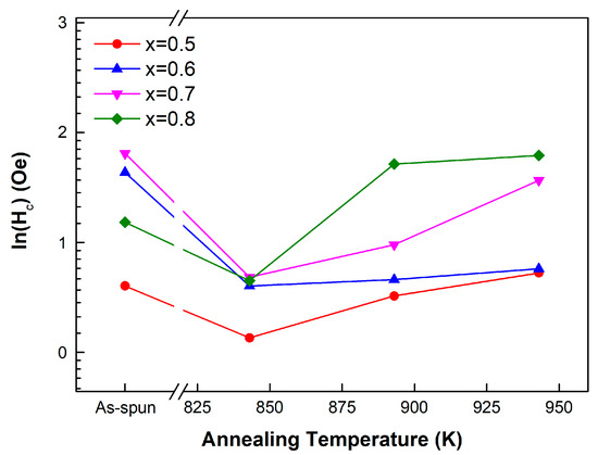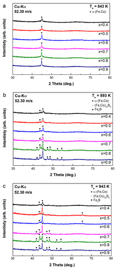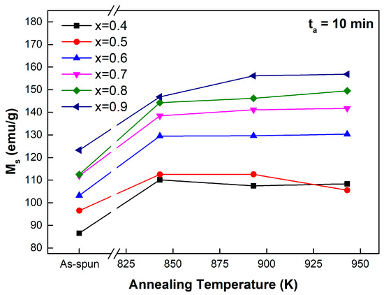 - The effect of heat treatment on (FexCo1−x)72B19.2Si4.8Nb4 (0.4 ≤ x ≤ 0.9, at 0.1 intervals) as-spun sample characteristics is as follows. We conducted heat treatment at 843 K, 893 K, and 943 K for 10 mins and investigated structural and magnetic property changes. Compared to as-spun ribbons, coercivity (Hc) showed reduced coercivity (Hc) when treated with 843 K in the heat treatment but increased coercivity (Hc) as heat treatment progressed to 893 K and 943 K. The saturation magnetization (Ms) value increased by heat treatment by up to 37 emu/g, but there was no significant saturation magnetization (Ms) improvement annealed at a high temperature compared to annealed at 843 K. After annealing at 843 K, all samples exhibit an α-(Fe, Co) phase, but after annealing above 893 K, the Fe3B and (Fe, Co)23B6 phases are also produced, deteriorating the soft magnetic properties. In particular, it was confirmed that the intensity or peak number corresponding to more Fe3B phases increased due to the correlation between the Fe content and the formation of the Fe3B phase when annealing was performed at x = 0.7 or more. Therefore, annealing the (FexCo1−x)72B19.2Si4.8Nb4 (0.4 ≤ x ≤ 0.9, at 0.1 intervals) alloy system near the first crystallization temperature can improve the soft magnetic properties.